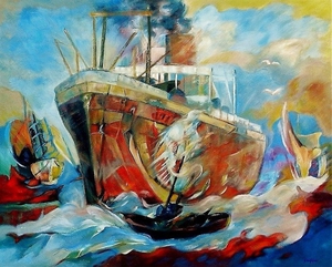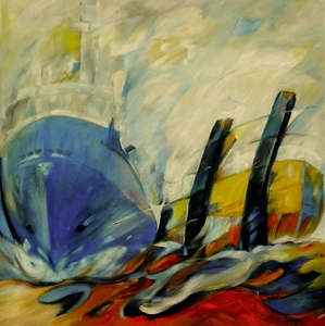 2022De golfslag, Poëzie Thérèse Madou Ik zwom en zwom in mijn droom tot ik verdronk, vocht tegen de hoge gutsende golven, maar zonk. Ik zonk en zonk tot aan de zandige grond, en sloot met hem een kortstondig verbond. Die aardse aanraking deed me ontwaken, en zag een grote haai die me wilde schaken. Was verwonderd van de onderzeese natuur, zwom langs groene planten in het blauwe azuur. Vissen met gekleurde strepen of stippen, daar kon de grijsbruine walvis niet aan tippen. Die besloot dat ik daar niet thuis hoorde, en vervolgens stoorde. Met zijn krachtige longzakken blies hij mij naar boven, waar weer een gevecht begon met de golven en rotskloven. Ik overwon de strijd, en werd door hen zachtjes bevrijd. De sterke zon deed me ontwaken, en zag de grote zee in al zijn doen en laten. Een stormvogel vloog over mij heen en weer, oogluikend volgde ik hem, tot hij in de rotsspleten neerzeeg. Het gele warme zand, gleed door mijn vingers uit de hand. Zag op het immense strand, een schilder en zijn bestand. Thérèse Madou. 02/03/2022